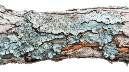 This stunning photo captures vibrant lichen growth on a weathered log, showcasing intricate textures and lively colors against a clean white backdrop.