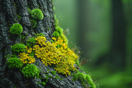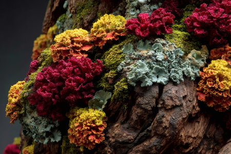 Vibrant moss and fungus colonies thrive on a textured tree bark, creating a captivating display of nature's artistry