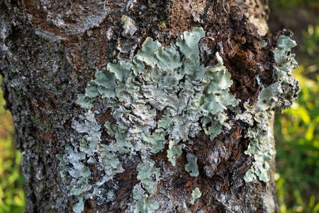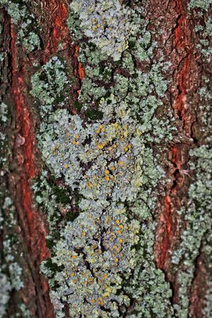Blue and orange lichen on a tree. Defeat of the tree trunk lichen. The texture of wood and lichen. A kind of moss on the bark of a tree. Selective focus