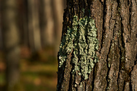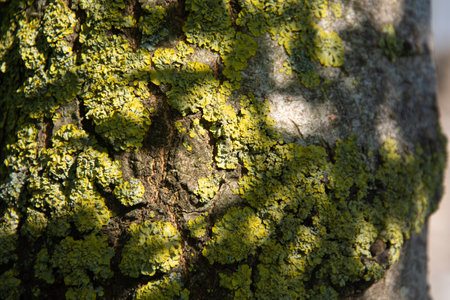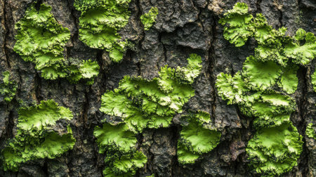 Bright green lichens thrive on the rugged texture of a tree's bark, showing nature's resilience and beauty in a tranquil forest environment under natural light.