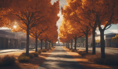 A picturesque urban street lined with majestic trees showcasing vibrant autumn foliage, basking in warm sunlight. A perfect serene moment for city lovers.