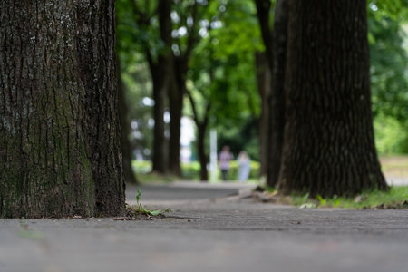 Old, thick trees grow in the park, sidewalk