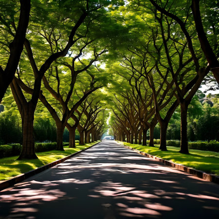 An avenue of trees forms a natural archway over a road, illuminated by sunlight. The scene features parked cars along the sides and offers a view toward the distant buildings. The style is naturalistic with vivid colors. This image could be suited for various purposes, like illustrating travel or natural beauty.