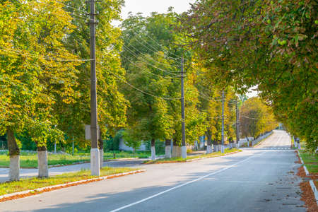 Empty asphalt road with large trees on the side of the road. Rural evening landscape.