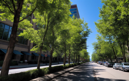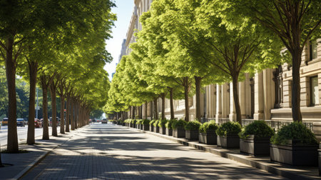 Urban streets shaded by majestic aligned trees, generative AI