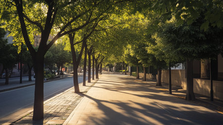A serene view of a tree-lined street bathed in warm sunlight, evoking a calming atmosphere ideal for leisurely strolls or peaceful drives.