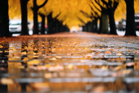 Autumn leaves on a wet asphalt road in the city. Beautiful autumn background