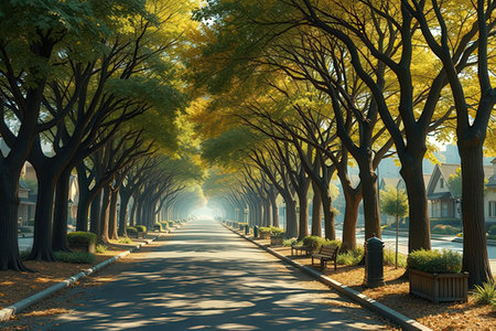A picturesque street scene featuring a row of mature trees arching over the road, creating a canopy. Sunlight filters through the leaves, casting dappled shadows. The composition emphasizes depth and natural elements, suggesting a residential setting. Suitable for illustrating natural beauty, community, or environmental themes.