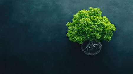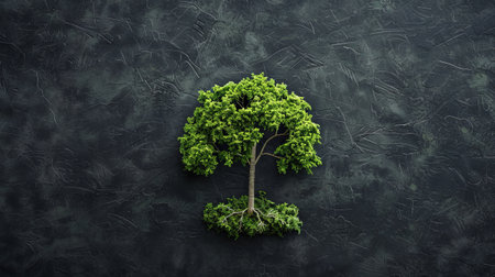 A vibrant green tree with lush leaves and exposed roots against a dark background, symbolizing growth and life in nature. Perfect for environmental themes.