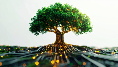 A magnificent tree thrives, its roots deeply embedded not in earth, but in a glowing network of digital information. This powerful visual represents the fusion of nature and technology, symbolizing concepts like sustainable innovation, green computing, and the growth of a digital ecosystem.
