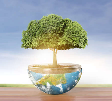 A lush green tree and patch of earth are encapsulated in a glass sphere, roots dangling, against a teal gradient background, symbolizing nature's fragility and preservation.