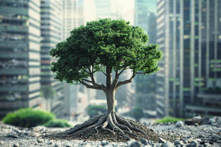A small tree with a large root system is growing in the middle of a city. The tree is surrounded by buildings and cars, but it stands out as a symbol of hope and growth in an urban environment
