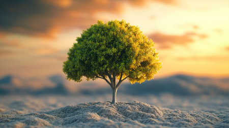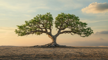 A striking image of a lone tree against a vast barren landscape at sunset, showcasing nature's beauty, strength, and tranquility in a serene outdoor setting.
