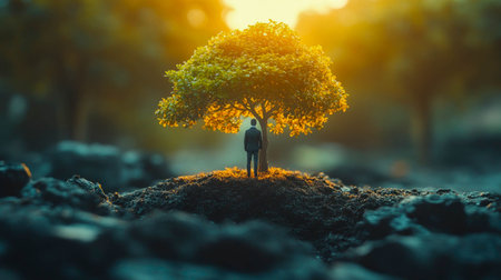 A businessman standing under a glowing tree at sunset, symbolizing leadership, growth, and sustainability in a serene environment.