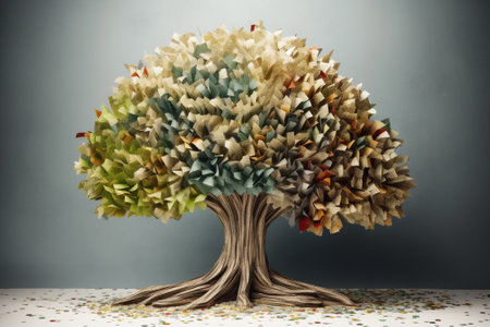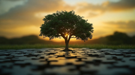 A puzzle transforms into a strong tree, embodying evolution and growth This artwork showcases adaptation, interconnectedness, and resilience It's a powerful metaphor for overcoming challenges and achieving wholeness Ideal for illustrating nature's strength and the beauty of synergistic relationships Explore this visual narrative of transformation AI Generative