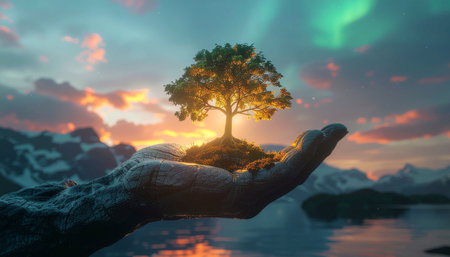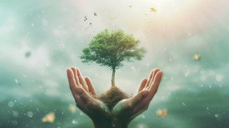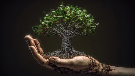 Conceptual image of a tree flourishing from soil held in human hands, symbolizing growth and environmental care. AIG41