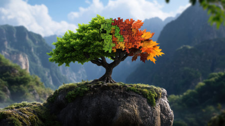 This imaginative image features a unique tree with vibrant, puzzle-shaped leaves in various colors, representing growth and change against a stunning mountain backdrop.