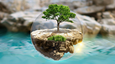 This imaginative image features a solitary tree growing on a rock, enclosed in a bubble above tranquil water, symbolizing nature resilience and beauty.