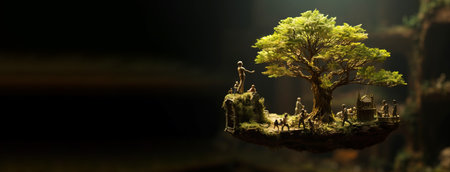 Miniature eco system with toy people, saving nature in a symbolic settlement. Header banner mockup with copy space.
