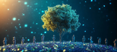 Diverse Group of People Around a Radiant Tree Symbolizing Environmental and Social Responsibility