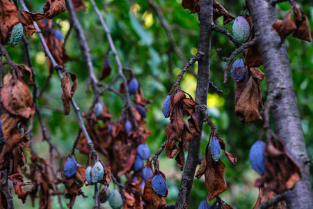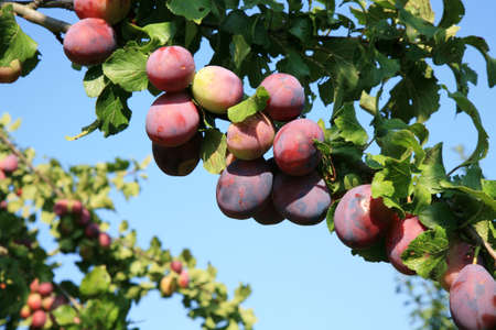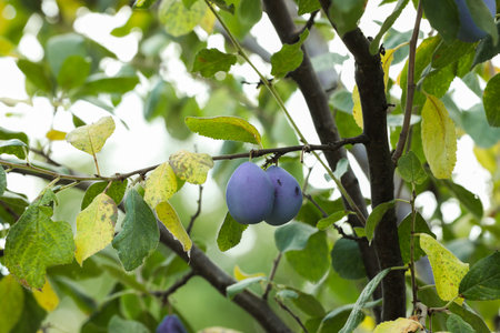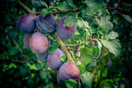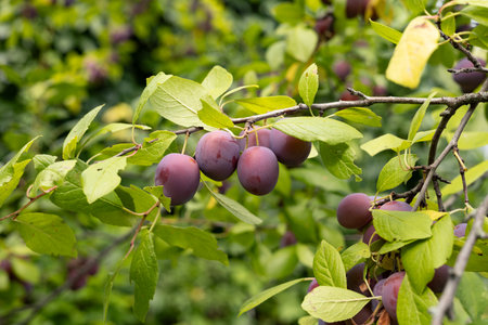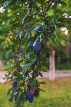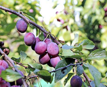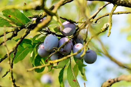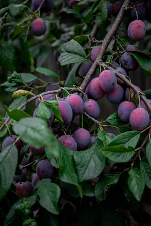 Garden ripe plums on a plum tree branch in an orchard. Garden, cottage, rural.