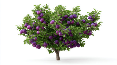 Lush purple-red fruits dangle amidst lush green leaves, basking in bright summer sunlight, promising a bountiful harvest in a vibrant orchard setting.
