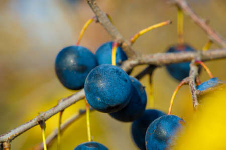 Blackthorn (Prunus spinosa) bush with berries in the evening