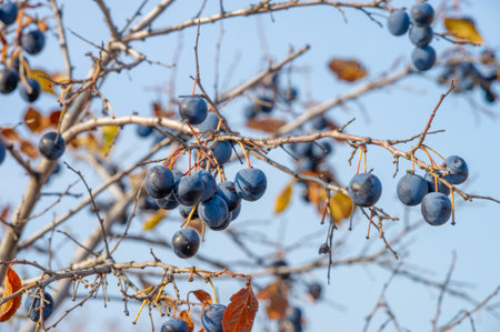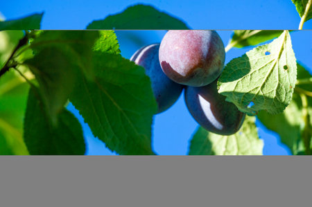 Plums ripe on branch in the orchard. View of fresh organic fruits on plum tree branch in the country, rustic fruit garden.