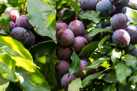 juicy ripe blue plum, a rich harvest on a tree in the garden on a summer day.