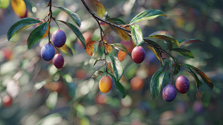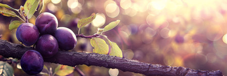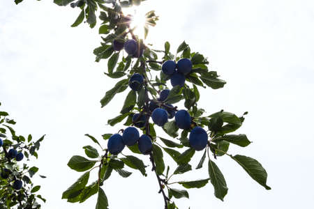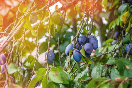 Plum tree branches with ripe sweet juicy fruits in sunset light in countryside