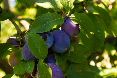 Ripe plums on the branches in the garden on a sunny morning. Selective focus.