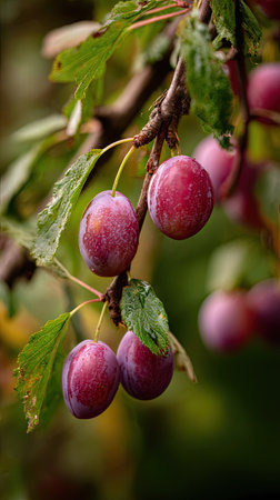 bunch of ripe plums on tree branch, Close-up. Organic farming, healthy eating,