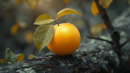 The Tamarillo in light fog, dew on leaves, light soft diffused, three-quarter view