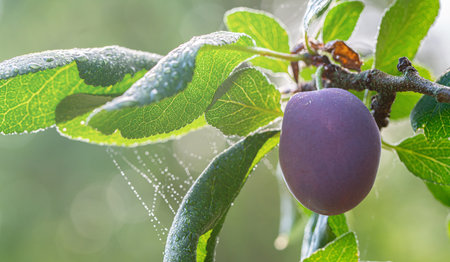 The Plum in light fog, dew on leaves, light soft diffused, three-quarter view