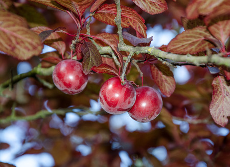Red berry cherry plum on branches among green leaves. Harvest, healthy nutrition.