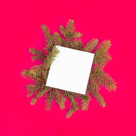 Winter holidays greeting card. White mockup board on green fir tree sprigs background. Copy space.