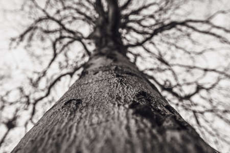 Bottom view of single tree with no leaves in black and white high contrast, bark texture selective focus