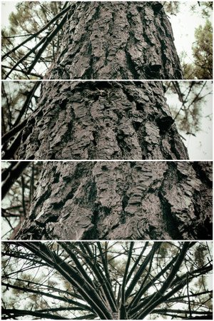 Moody pine tree trunk, bottom view, creative angle