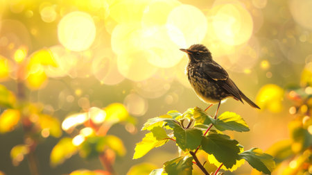 An AI generated illustration of a bird perched on a branch, illuminated by the warm autumn sun
