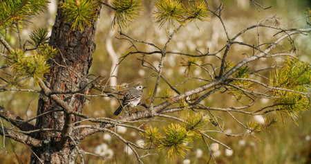 a small bird perches on a branch in a small grassy area, surrounded by light green and brown tones. captured with a nikon af600, the photo showcases photorealistic detailing. the composition is majestic, earning it the title of contest winner. this stunning image follows the larme kei style and can be found on flickr. ai generated