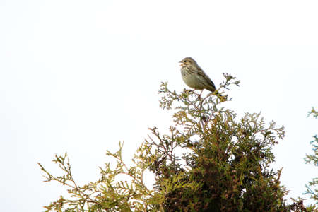 The corn bunting (Emberiza calandra) sitting on the grean branch. Not common, but very rear big songbird. White sky in the background.