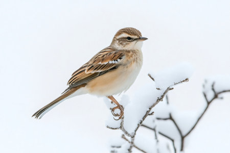 Bird with brown and white plumage perching on a snow covered branch against a bright white winter background