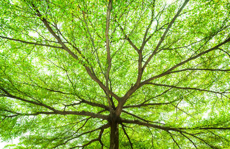 An upward perspective captures a large tree with dense, green leaves reaching towards the sky. The image showcases a textured tree trunk and branches that fill the frame. This natural composition, with overhead lighting, provides a visually appealing look suitable for various commercial or editorial applications.