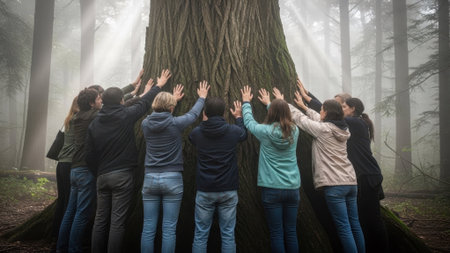 A diverse group of individuals connect with nature by placing their hands on the textured bark of a massive, old tree surrounded by a foggy woodland environment