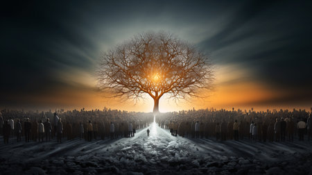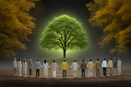 Group of people holding hands around a glowing tree symbolizing environmental conservation, teamwork, and hope for a sustainable future