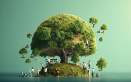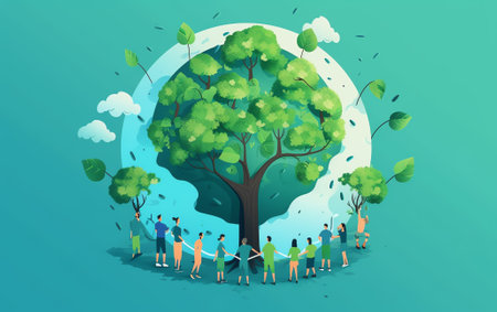 A vibrant scene showcases diverse figures holding hands around a sprouting plant, symbolizing unity and environmental care in a lush natural setting.