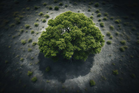 A single green tree stands tall amidst lush field of smaller plants, with blurred urban cityscape background, symbolizing