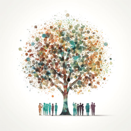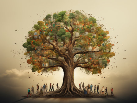 This artwork features a tree formed by numerous figures in various colors, symbolizing community unity. The background is solid, giving depth to the scene and enhancing emotional resonance.