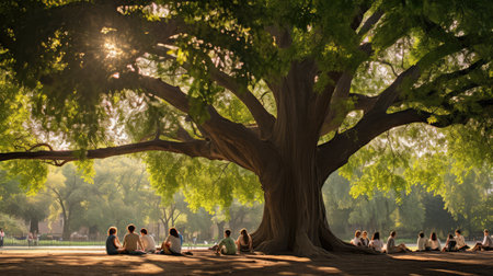 Serene scene people meditating beneath a majestic tree with vibrant colorful foliage and blue sky