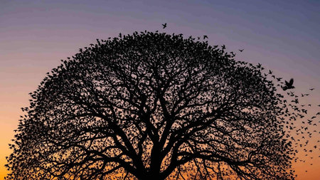 A diverse group of individuals stands in a circle, holding hands beneath a sprawling ancient tree as the sun sets in the background. The warm golden light filters through the trees leaves, creating a magical atmosphere. Everyone appears engaged in a shared experience, embracing the moment of togetherness and connection to nature. The peaceful surroundings enhance the sense of community and harmony among the participants.